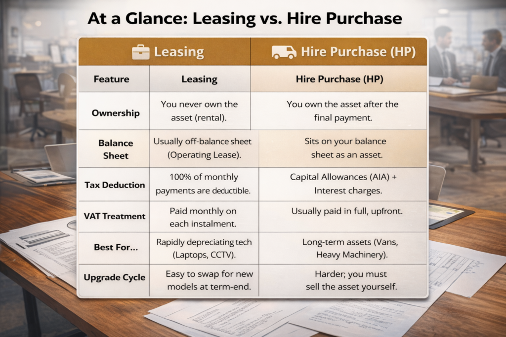 In the battle of leasing vs hire purchase, Hire Purchase is generally more tax-efficient for businesses looking for immediate, large-scale relief through Capital Allowances. Leasing, however, is the winner for businesses prioritising cash flow and VAT management.